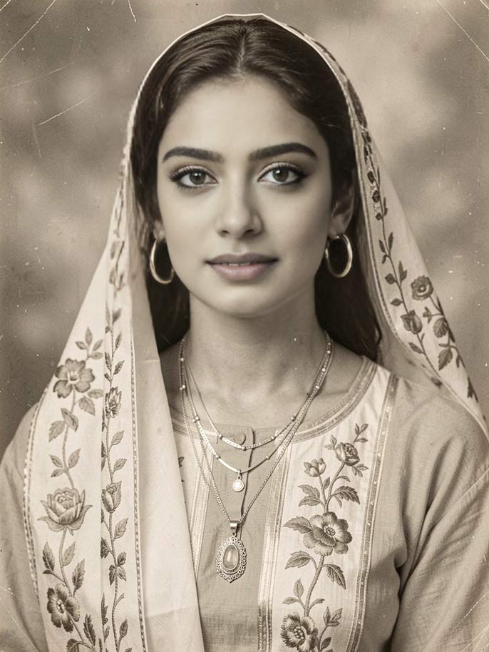 The look suits embroidered outfits, dupattas, layered necklaces, and other classic styling cues while keeping the final portrait polished instead of overly theatrical.