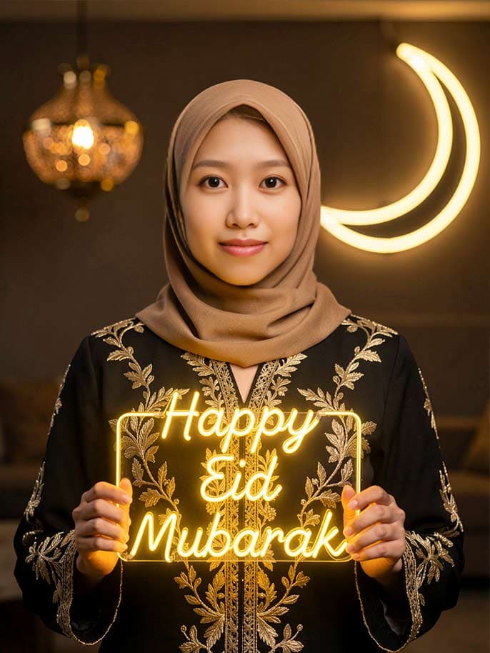 Choose the Happy Eid Mubarak AI Filter from the template gallery. The AI automatically enhances your photo with festive clothing textures, decorative patterns, and a warm holiday atmosphere.