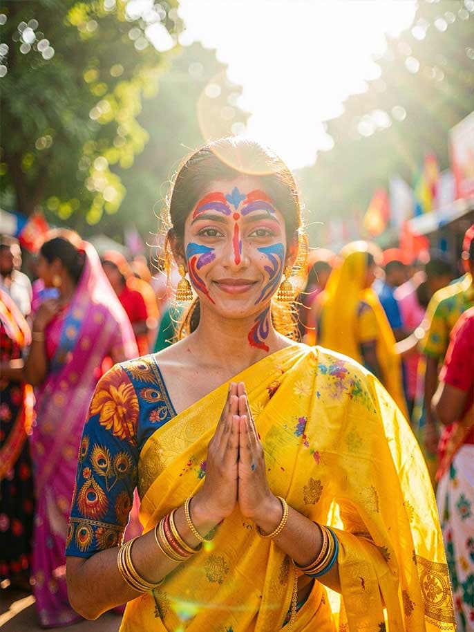 Facial features, painted colors, and hand gestures such as palms pressed together are carefully refined to maintain natural proportions and emotional warmth. The filter ensures that expressions remain genuine and culturally respectful.