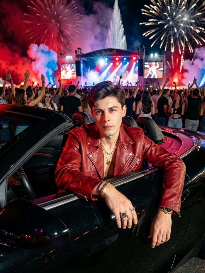 Pick the Music Festival filter to add stage lights, fireworks, a cheering crowd, and a convertible-led festival entrance look.