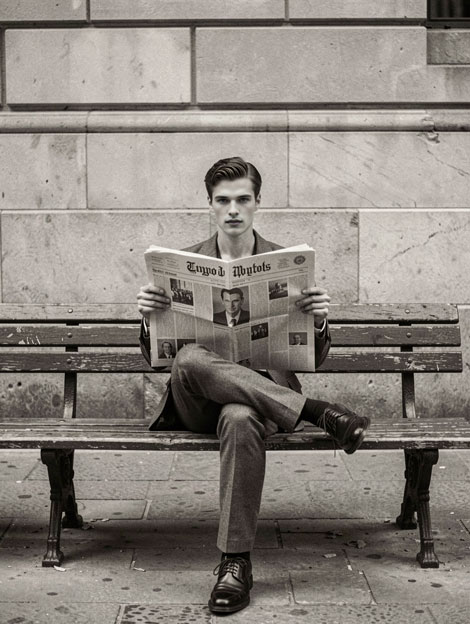 Place your portrait into a composed newspaper-reading moment with tailored styling, seated posture, and a story-led city look that feels quiet and intentional.